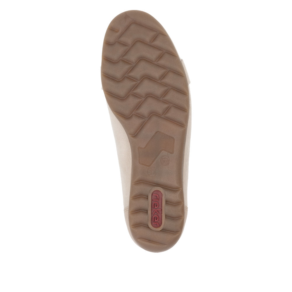Ballerinasko fra Rieker med en dekorativ detalj i gull. Med Rieker Antistress-teknologien oppnås en lett og fleksibel sko som gir god støtte og komfort. Overdelen av skinn og tekstilfôr sikrer en særdeles behagelig følelse. Det elastiske båndet langs kanten sørger for at passformen er optimal. Myk, skinnbelagt innersåle øker komforten. De fleksible og støtdempende TR-yttersålene sikrer at skoene er behagelige å bruke. Med F-lest som passer perfekt til normalt brede føtter. Denne ballerinaskoen fra Rieker er både stilig å se på og en nytelse å bruke.