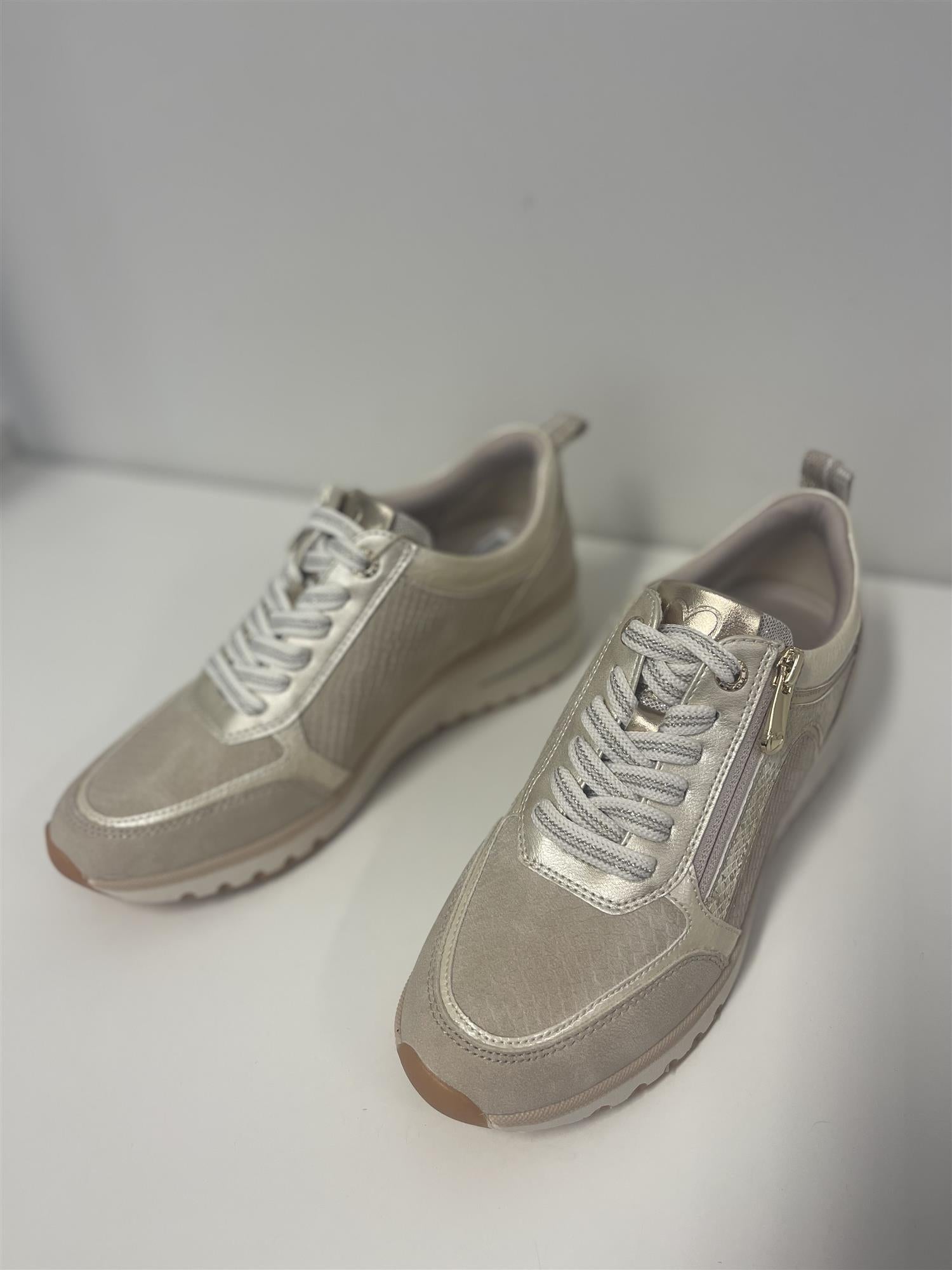 Sneakers fra Marco Tozzi i en kombinasjon av imitert skinn og tekstil med tekstilfòr. Den har en lett og dempende innersåle og både lisser og glidelås, slik at den kan tilpasses godt til foten og er lett å ta av og på. Dette er en sneakers med lekre detaljer samtidig som den er god på foten og passer til alle antrekk.