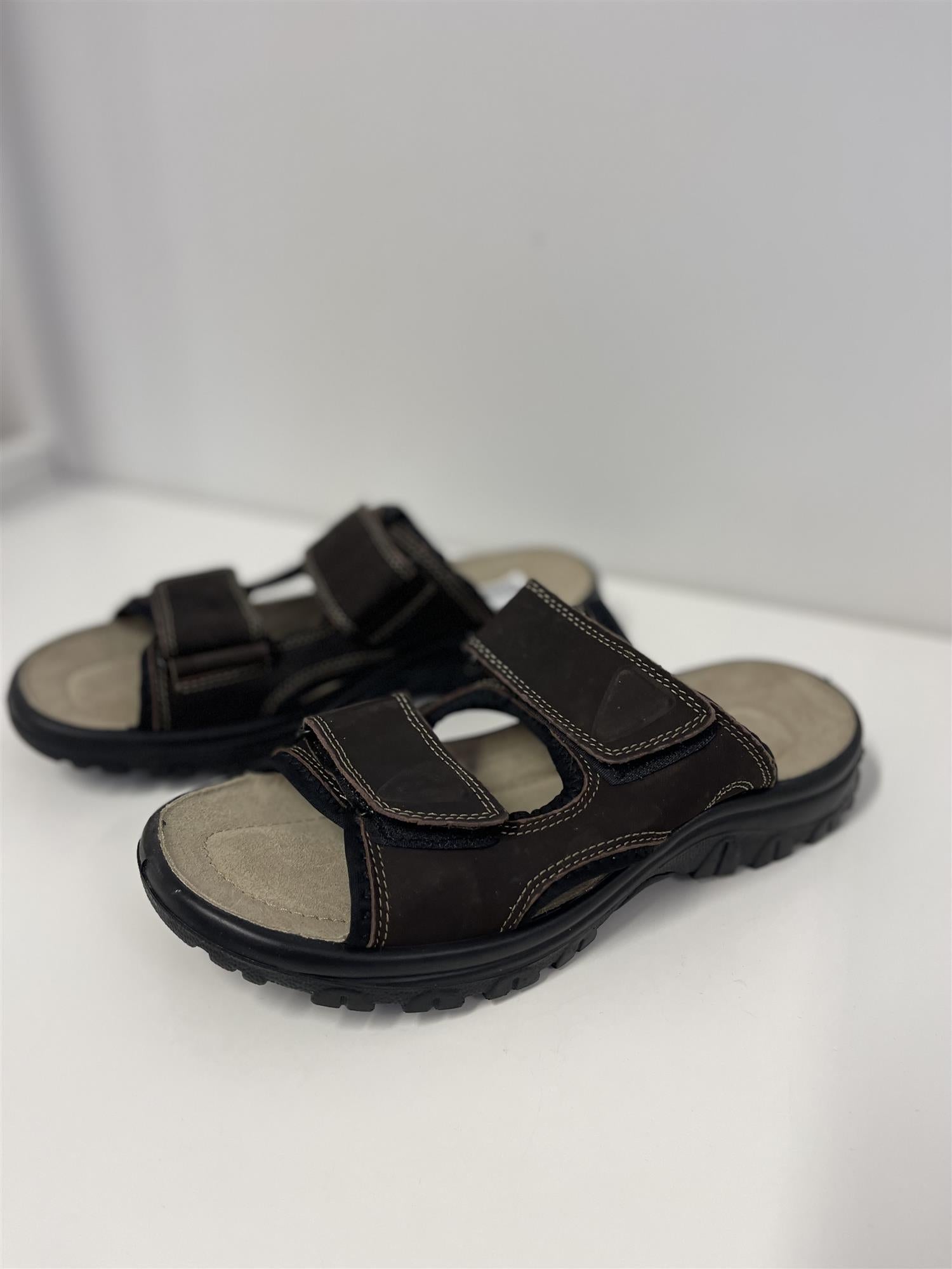 Herresandal med innerste i skinn. Sandalen har polstrede remmer med borrelås lukking.